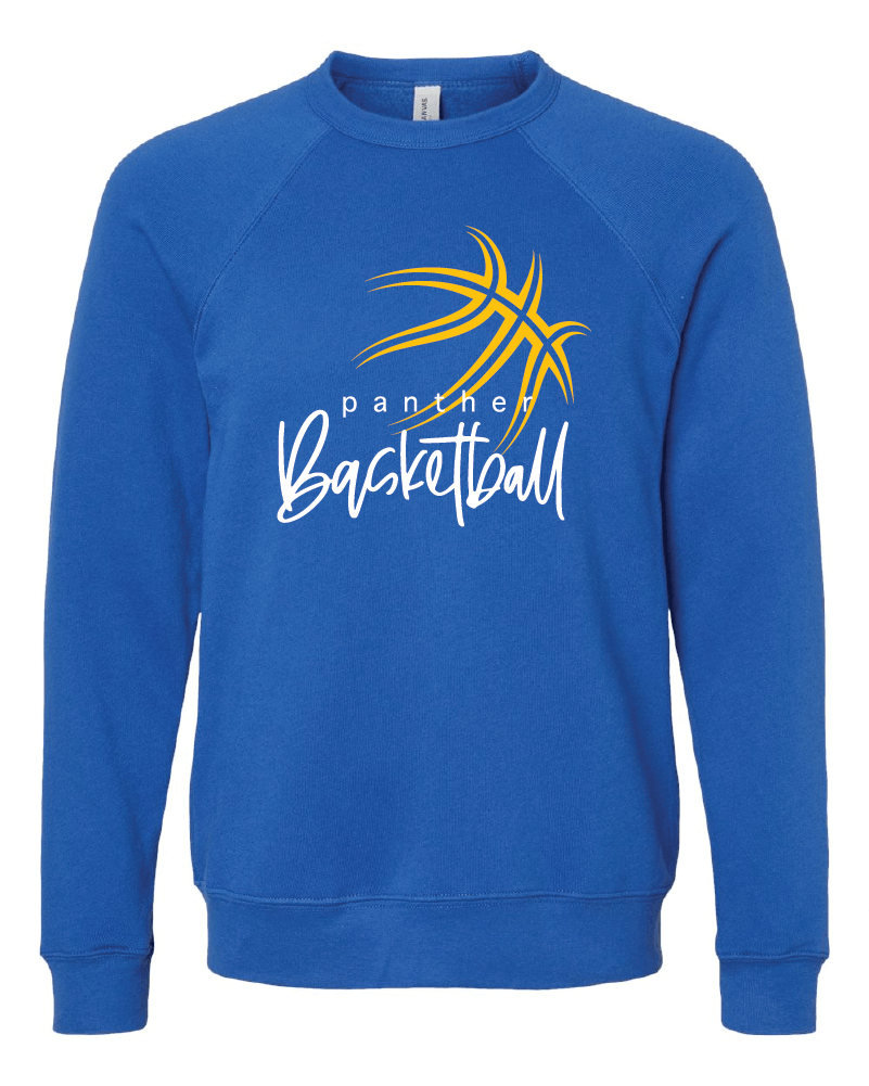 Bella Canvas Raglan Sponge Fleece Unisex Crewneck Sweatshirt – Royal Blue with white and yellow panther basketball logo.