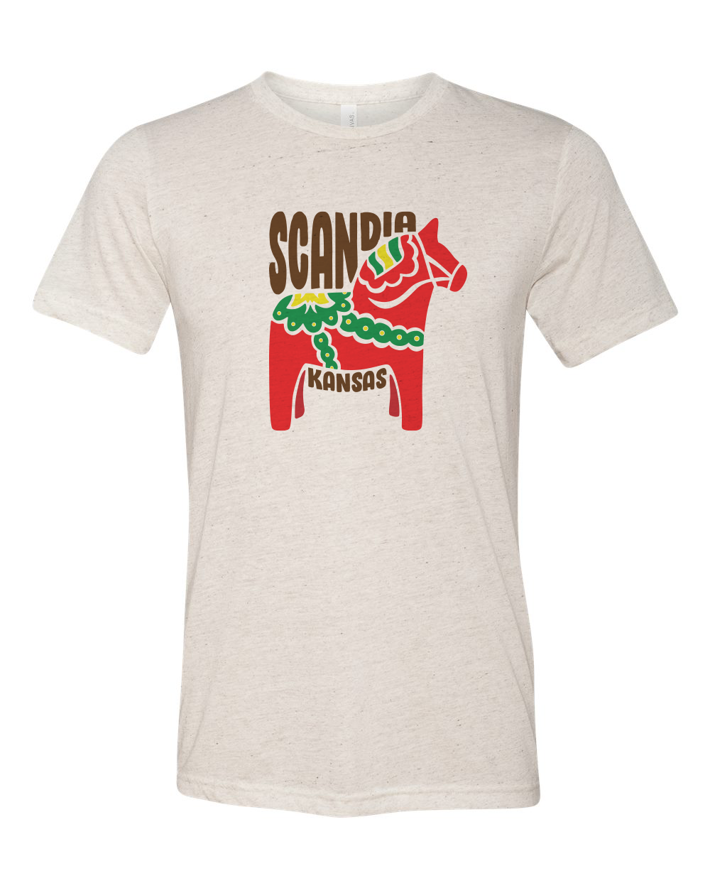 The iconic Scandia Dala Horse in full color on a Bella Canvas oatmeal colored tee!